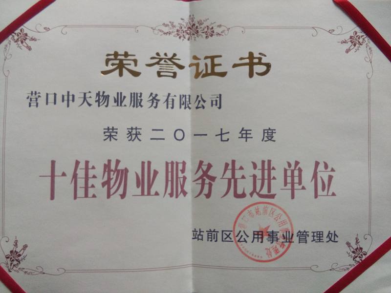 2月6日營口市站前區公用事業管理處召開2017年度表獎大會,會上授予中天物業 “2017年度十佳物業服務先進單位”稱號。