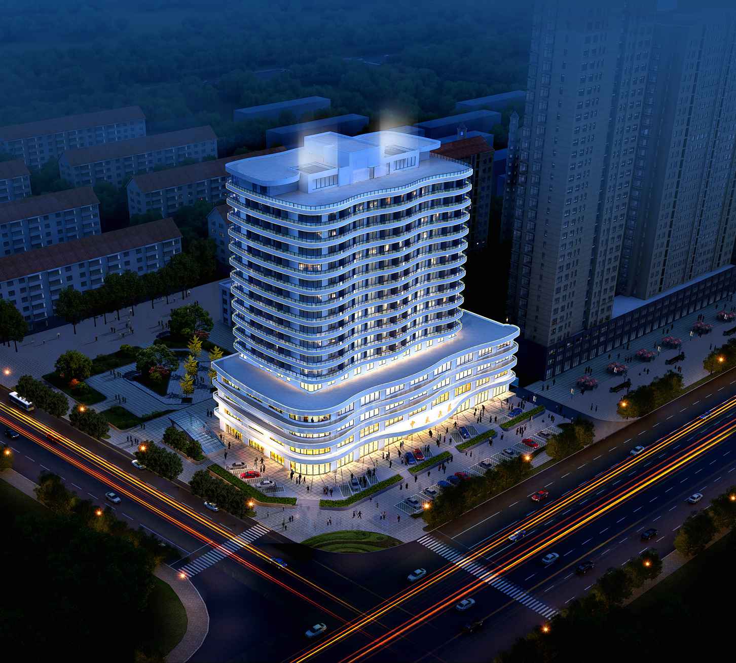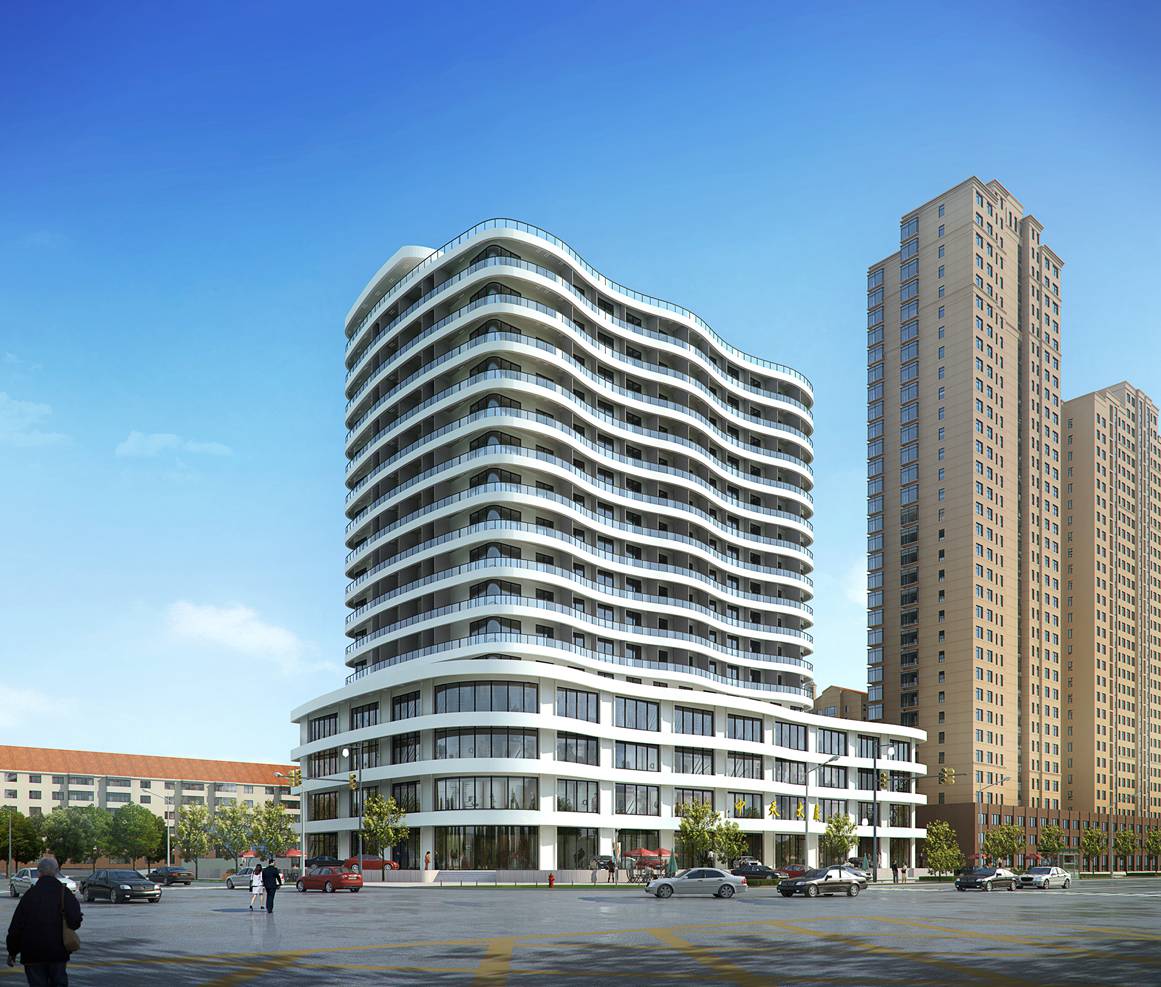 在建筑表現形式上,采用現代建筑風格,建筑立面結合營口作為海濱城市特點,利用框架剪力墻結構的支撐,每一層都包裹上鋼筋混凝土懸臂弧形陽臺,借用曲邊陽臺前后進出起伏的變化,營造出近似水紋波浪的建筑表現。采用高檔外墻飾面層,通過精雕細刻的施工工藝,呈現出精致美觀的城市建筑,完善城市的天際線,豐富城市的建筑街景。