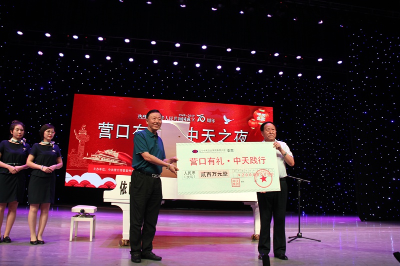 為紀念中華人民共和國成立70周年,9月9日晚,中天集團攜手中共營口市委宣傳部,在遼河大劇院共同舉行“營口有禮·中天之夜”紅色經典系列音樂會。活動當晚,集團董事長于寶權向營口市慈善總會捐贈200萬元,用做“營口有禮”專項基金。營口市委常委、市委秘書長王百勝,市委常委、宣傳部部長肖力,市人大常委會副主任徐啟,副市長金莉,市政協副主席馬春山,集團董事長于寶權,總經理于洪波,西市區區委、區人大、區政府、區政協等領導及首屆禮德榜樣代表,與集團員工和業主代表等近千人共饗音樂盛宴,踐行“雷鋒精神,營口有禮”。