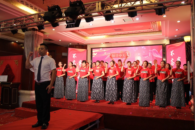 集團總部機關代表隊當《沒有共產黨就沒有新中國》的旋律響起,當巨型的國旗升起,贏得了熱情的掌聲。一首《眾人劃槳開大船》,唱出了特有的氣勢。特別是于寶權董事長和于洪波總經理登臺演唱,把演唱推向了高潮。萬豪酒店代表隊表演的《紅色娘子軍》,在馮國總經理的指揮下,非常有氣勢,具有很高的感染力。