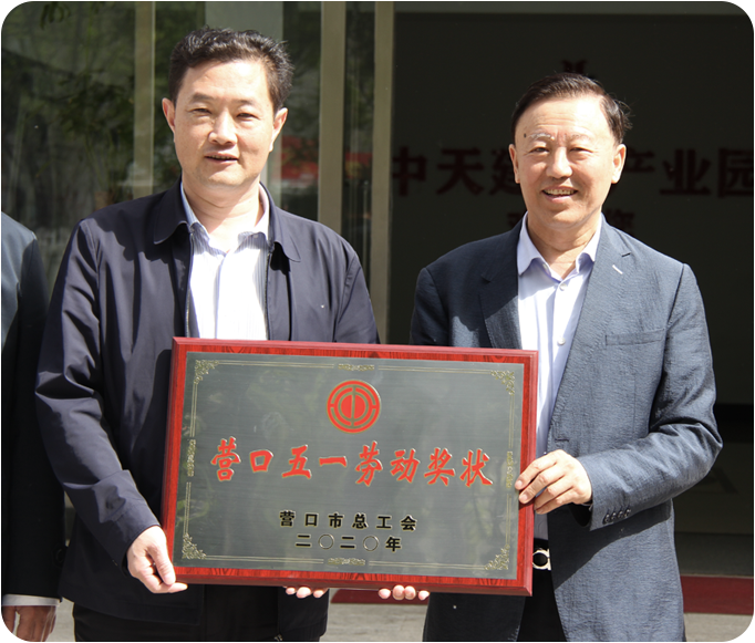 5月14日上午,營口市西市區委副書記、區政府區長王殿豐;區委常委、組織部長冷震;區委常委、統戰部長蔣小蘭;區總工會主席張相勝等領導在中天建筑產業園向中天集團授予“營口五一勞動獎狀”榮譽,于寶權董事長代表中天集團授領獎牌。
