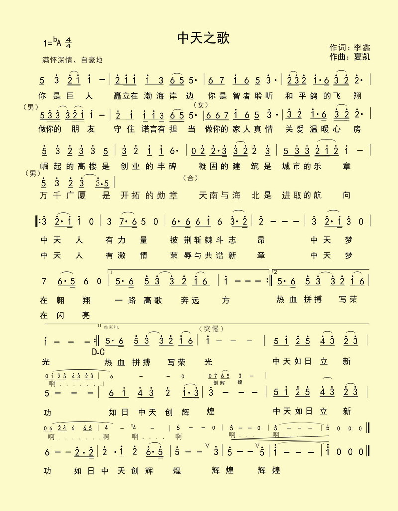 為了弘揚中天精神,鼓舞中天人意氣風發的斗志,集團在紀念二十周年活動中,創造了企業主題歌《中天之歌》,用歌聲迎接二十周年慶典?!吨刑熘琛酚杉瘓F總裁辦公室主管李鑫寫詞,夏凱譜曲,以優美的旋律表達中天人的心聲。你是巨人,矗立在渤海岸邊,你是智者聆聽和平鴿的飛翔,崛起的高樓是創業的豐碑,凝固的建筑是城市的樂章。做你的朋友,守住諾言有擔當,做你的家人,真情關愛溫暖心房,萬千廣廈是開拓的勛章,天南與海北是進取的航向。中天人有力量,披荊斬棘斗志昂,中天夢在翱翔,一路高歌奔遠方,中天人有激情,榮辱與共譜新章,中天夢,在閃亮,熱血拼搏寫榮光。中天如日立新功,如日中天創輝煌。