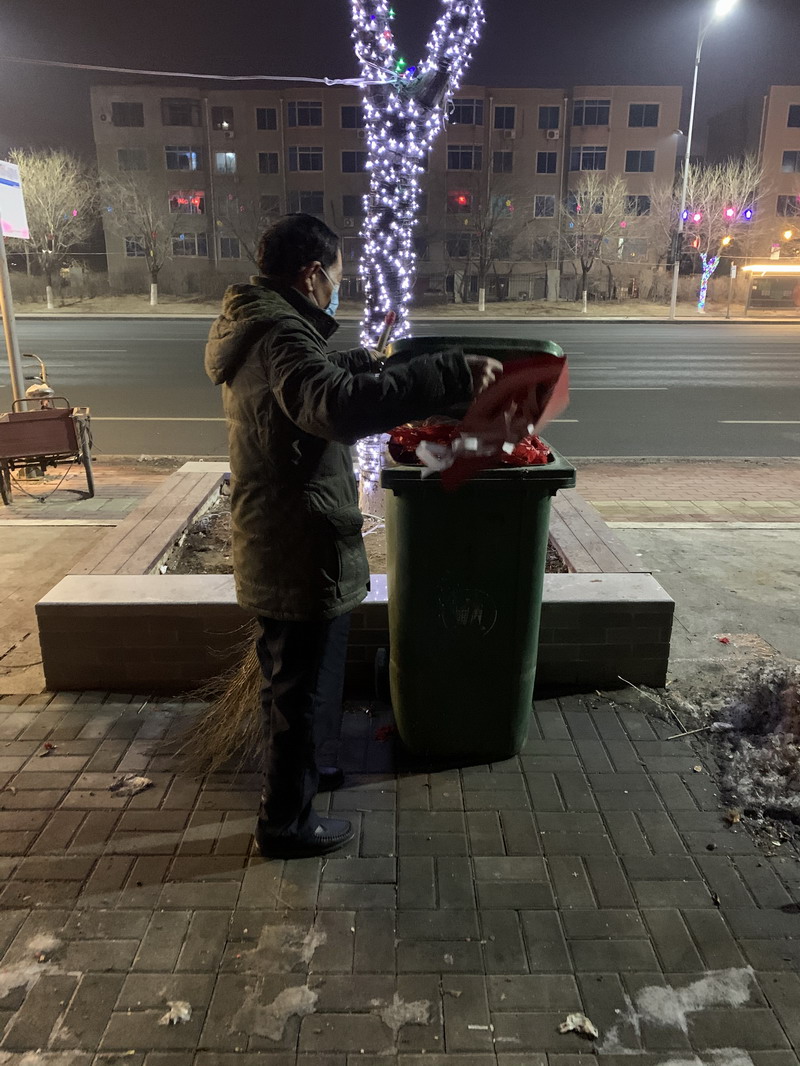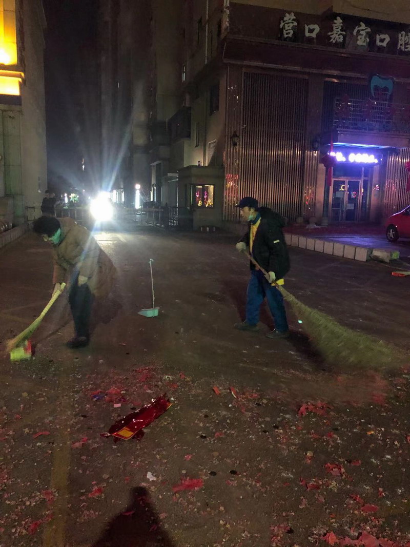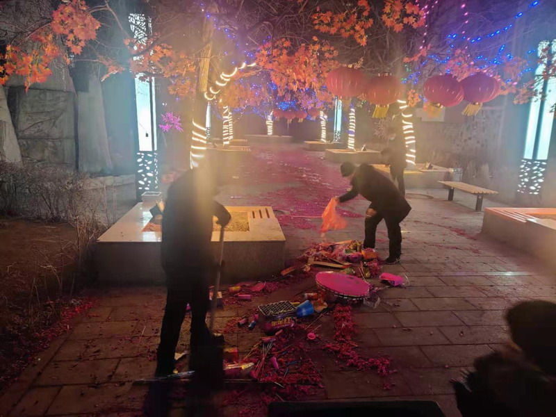 除夕夜燃放煙花爆竹是春節(jié)慶祝的方式,晚上十點(diǎn),是物業(yè)人的集結(jié)令,當(dāng)大家都沉浸在過(guò)年的闔家歡樂(lè)的喜慶氛圍中,中天物業(yè)全體員工卻投入清掃的崗位中,是他們將轄區(qū)燃放的爆竹紙屑清掃的一塵不染。凡是有鞭炮紙屑的地方就有我們物業(yè)人的身影,微笑著穿梭在轄區(qū)的各個(gè)角落,他們彎身弓腰、揮掃裝袋。當(dāng)業(yè)主們初一清晨走入園區(qū)時(shí),映入眼簾的仍然是干凈、整潔、安全的社區(qū)環(huán)境。
