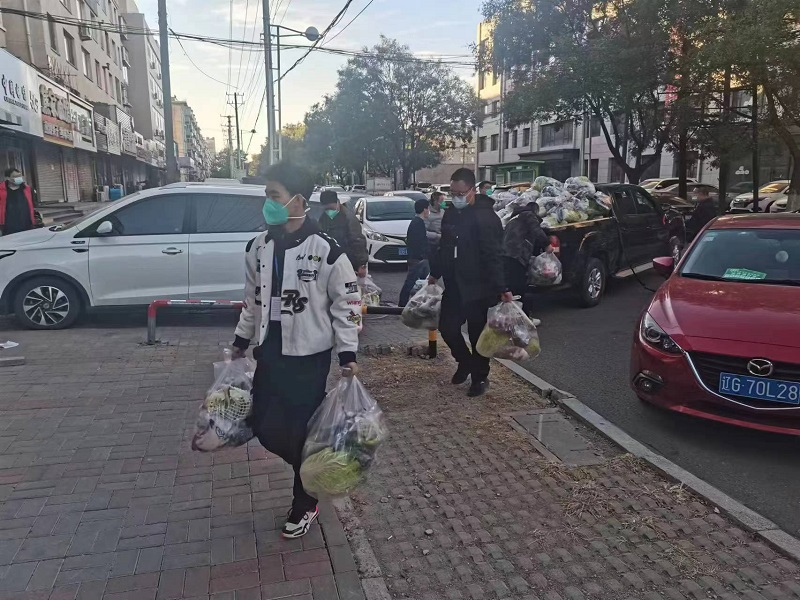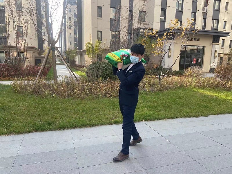 盤錦及撫順物業公司服務的幾個項目,都是新交房小區,面對入住業主較少,裝修工人滯留,物業積極聯系社區做好封控人員的核酸檢測工作。由于人員緊缺,不少物業人員24小時堅守在項目,一人身兼數職,保安剛幫業主把物品送上樓,又要馬上幫助保潔人員對大堂進行消殺工作;保潔員除了園區衛生清潔,樓道消殺,還要上門收垃圾;房管員受裝修完未入住業主委托上門澆花……一件件小事,卻大大的溫暖了業主,撫順中天首府的業主還專門在撫順交通廣播電臺上講述了中天物業的溫暖故事。為了讓業主安心居家,物業還采購蔬菜包、大米等物資免費為居家業主發放,同時為了減少聚集,物業工作人員挨家挨戶送到業主手中,讓防控有力度,抗疫有溫度。