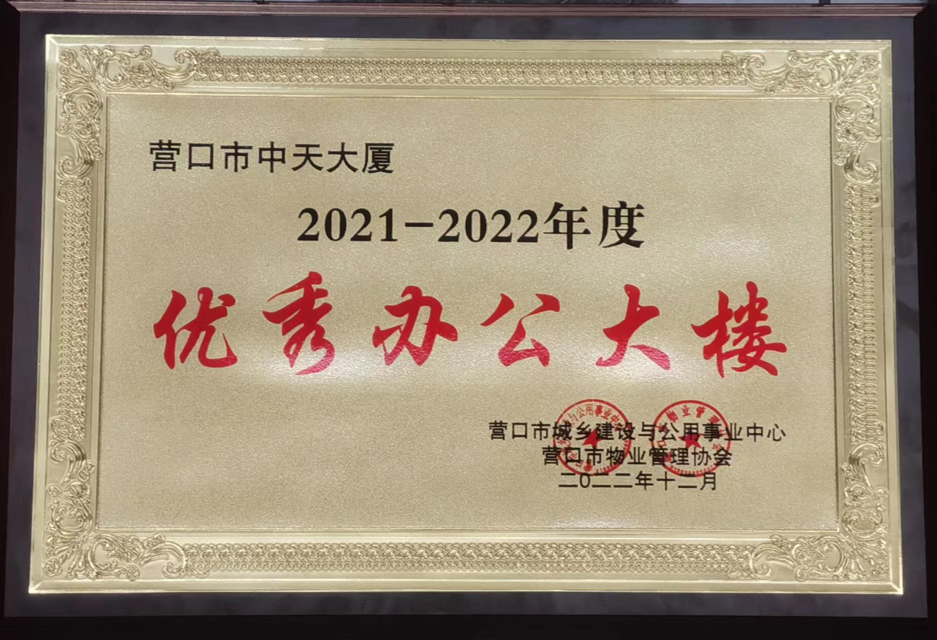 3月9日下午,營口市城鄉(xiāng)建設(shè)與公用事業(yè)中心和營口市物業(yè)管理協(xié)會(huì),在財(cái)富酒店召開“2021-2022年度營口市優(yōu)秀物業(yè)服務(wù)項(xiàng)目、優(yōu)秀服務(wù)人員評(píng)選活動(dòng)”頒獎(jiǎng)典禮。中天大廈在全市各機(jī)關(guān)企事業(yè)辦公大樓中,與其它17家單位共同獲得“優(yōu)秀辦公大樓”稱號(hào),項(xiàng)目經(jīng)理趙瑩代表上臺(tái)領(lǐng)獎(jiǎng)。