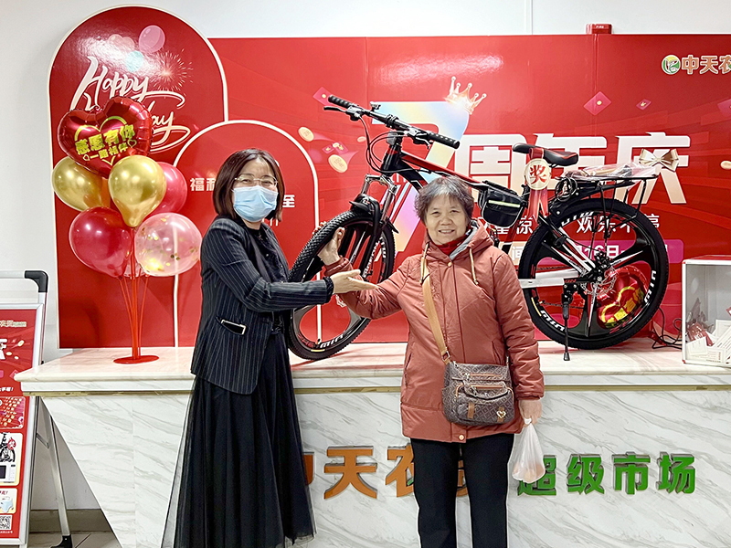同時為感謝廣大顧客七年以來對中天農貿的支持與厚愛,市場在慶典當天投放了千枚鮮雞蛋,免費領,共慶生,傾情回饋七年的相伴,最后的重頭戲,是最令人期待的大抽獎環節,本次慶典活動獎品除了微波爐、電烤箱、料理機、電熱鍋等小家電以外,還特別增設了特等獎——品牌變速山地車,面對豐厚的獎品,熱情的顧客們都已按捺不住激動的心情,迫不及待的想知道自己是不是幸運兒,隨著主持人念出幸運號碼,現場一片笑語歡聲,開獎結束后,農商公司總經理孫晶為中獎顧客頒獎并合影留念。