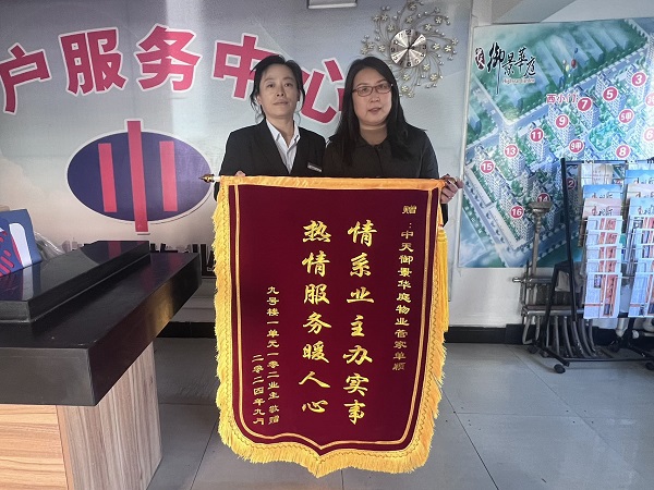 “你們對我母親太關心了太照顧了,真心感謝你們!”10月15日下午,御景華庭9號樓1單元102的業主郭女士手持著一面印著“情系業主辦實事,熱情服務暖人心”的錦旗,滿懷謝意的走進了御景華庭物業服務中心。感謝物業人員平日里對家中母親的熱情服務和悉心照顧。