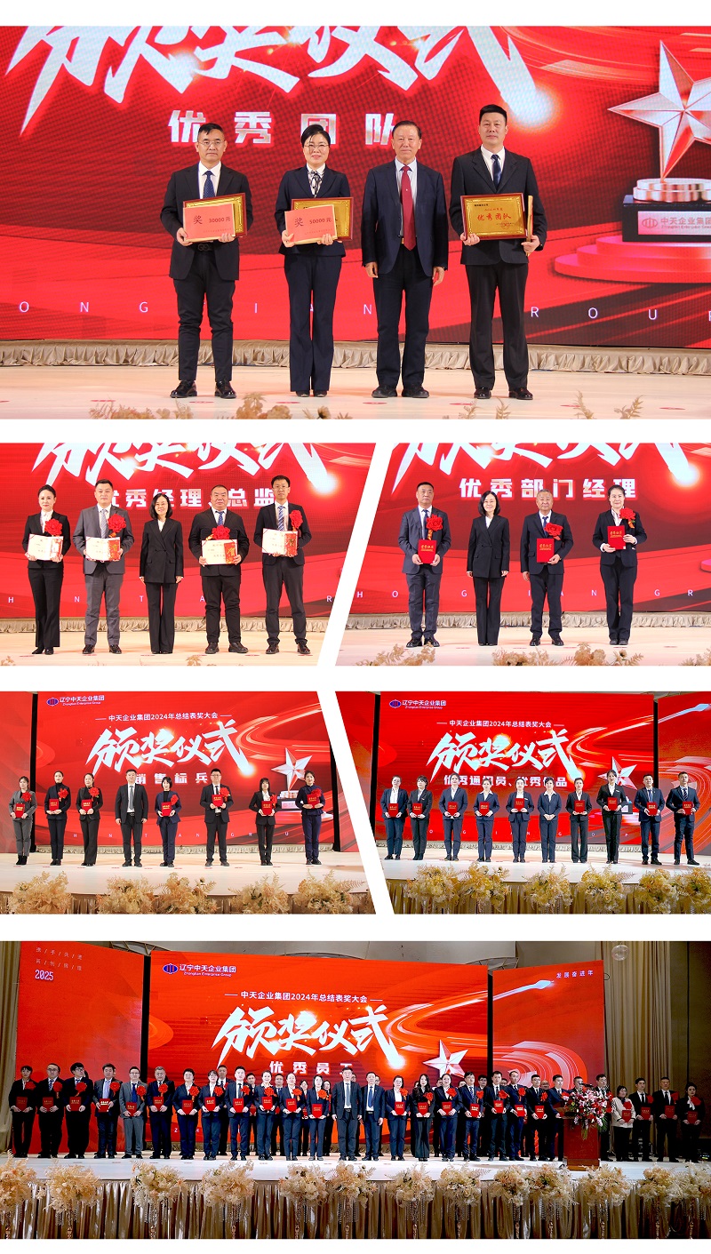 王曉青總裁助理宣讀了集團2024年度表獎決定,錦州城市公司、農貿管理公司、集團總部財務管理中心三個單位獲得優秀團隊;大連城市公司總經理許棕雯、酒店管理公司總經理李敏獲得優秀總經理;集團總部成本招采管理中心總監譚學鍇、集團總部項目管理中心總設計師盧詩揚獲得優秀總監;撫順城市公司副總經理李巖、集團總部人力資源部經理王慧博、集團總部工程裝修部經理蘆偉三人獲得優秀部門經理;總部財務管理部出納主管姚蘭等47人獲得優秀員工;錦州城市公司書香庭院項目銷售主管郭羽淑等7人獲得銷售標兵。會上,舉行了隆重的表獎儀式。同時還表獎了《中天之窗》和《中天視角》優秀通訊員和優秀作品的獲獎人員。