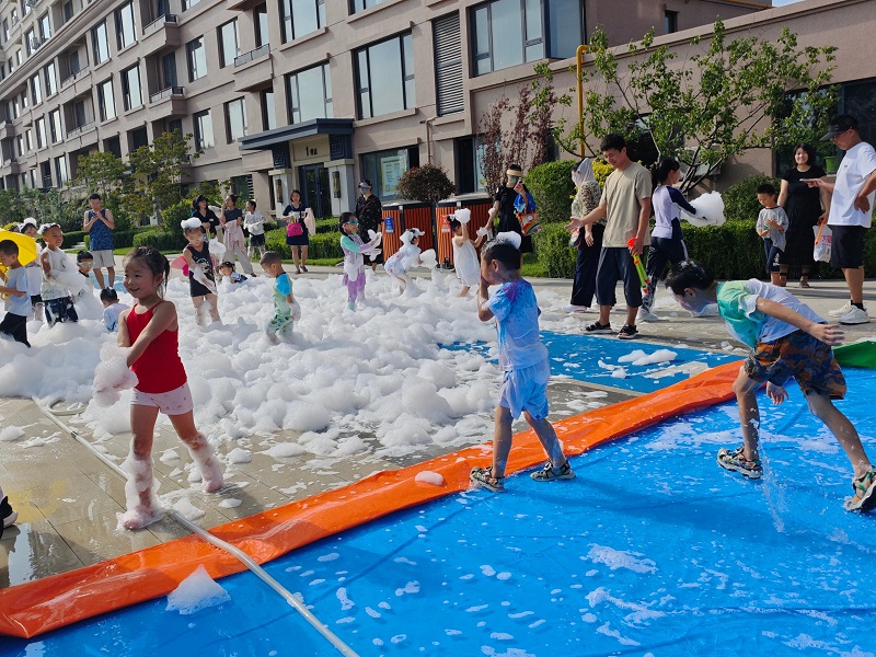 暑氣未消,水花正好。夏末時節,中天華府為業主家人們帶來了一場“繽紛泡泡趴·一起狂歡”親子活動。8月23日下午,中天華府二期39#樓前化身夢幻樂園,45組新老業主家庭攜手孩子,共赴盛夏之約,在泡沫與歡笑中度過了一個沁涼而充滿童趣的午后。