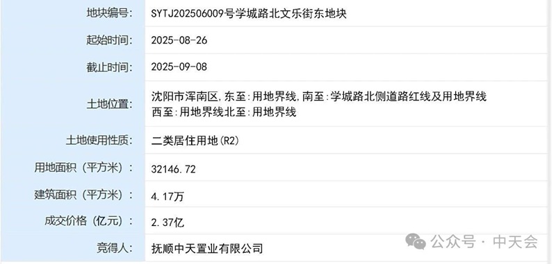 2025年9月8日,遼寧中天企業集團旗下撫順中天置業有限公司以2.37億成功斬獲備受矚目的沈陽市渾南區核心板塊長青學城路北、文樂街東地塊,標志著中天集團成功進軍沈陽市,進一步實現布局遼寧的戰略構想,企業戰略發展版圖再擴張。