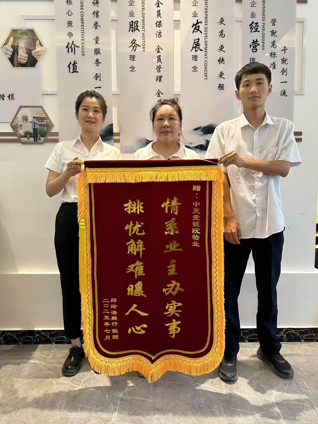 2025年7月12日,壹號院小區門市業主邱女士帶著一面寫有“情系業主辦實事 排憂解難暖人心”的錦旗,送到了小區物業服務中心,向物業工作人員及管家表達感謝。接下來,就讓我們一起走進錦旗背后的故事吧!