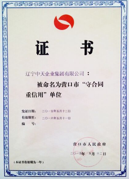 在激烈的市場(chǎng)競(jìng)爭(zhēng)中,“誠(chéng)信”是企業(yè)最大的品牌。中天集團(tuán)自成立以來(lái),始終注重加強(qiáng)企業(yè)的誠(chéng)信建設(shè),堅(jiān)持誠(chéng)信為本、信用至上的發(fā)展原則,用誠(chéng)信打動(dòng)客戶、用誠(chéng)信贏得市場(chǎng),打造“誠(chéng)信中天”的企業(yè)品牌。2015年,集團(tuán)再次被評(píng)為市“守合同重信用”單位,這是中天集團(tuán)多年來(lái)一直堅(jiān)持守合同重信用工作,以誠(chéng)信推動(dòng)企業(yè)發(fā)展的結(jié)果;是對(duì)中天集團(tuán)全體員工日常點(diǎn)點(diǎn)滴滴辛勤工作的溫情回報(bào);更是社會(huì)各界對(duì)中天集團(tuán)持續(xù)、穩(wěn)健發(fā)展的充分認(rèn)可與贊揚(yáng)。