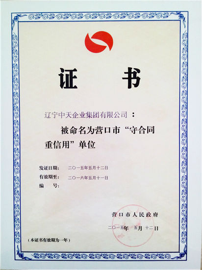 10、集團連續11年榮獲“守合同重信用”單位榮譽稱號。5月20日,集團再次被評為市“守合同重信用”單位,這是集團連續十一年獲此殊榮。這既是中天集團多年來一直堅持守合同重信用工作,以誠信推動企業發展的結果;又是對中天集團全體員工日常點點滴滴辛勤工作的溫情回報;更是社會各界對中天集團持續、穩健發展的充分認可與贊揚。