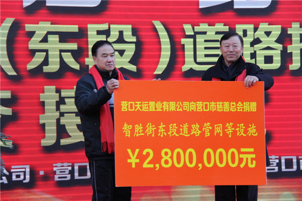 2016年12月10日,由中天集團投資捐建的營口市智勝街開通捐贈交接儀式華彩啟幕,標志著這條長400余米,寬15米,總投資280萬元的公共道路正式開通,疏通了營口市城南板塊的交通,方便了附近小區居民的出行。營口市政府副市長董永安、營口慈善總會副會長郭慶嘉、中天集團于寶權董事長等領導與2000多位市民共同見證了中天集團慈善義舉,修路善行,造福一方。
