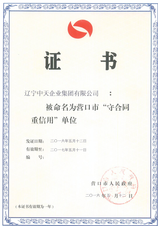 10、集團(tuán)連續(xù)12載榮獲“守合同重信用”單位稱(chēng)號(hào)。2016年中天集團(tuán)再次被營(yíng)口市人民政府授予“守合同重信用”單位稱(chēng)號(hào),連續(xù)12年獲此殊榮,不僅是全體員工多年勤奮工作、共同努力的結(jié)果,更是集團(tuán)恪守誠(chéng)信、規(guī)范經(jīng)營(yíng)的有力印證,也是對(duì)中天優(yōu)秀品牌信譽(yù)建設(shè)成果的充分肯定。