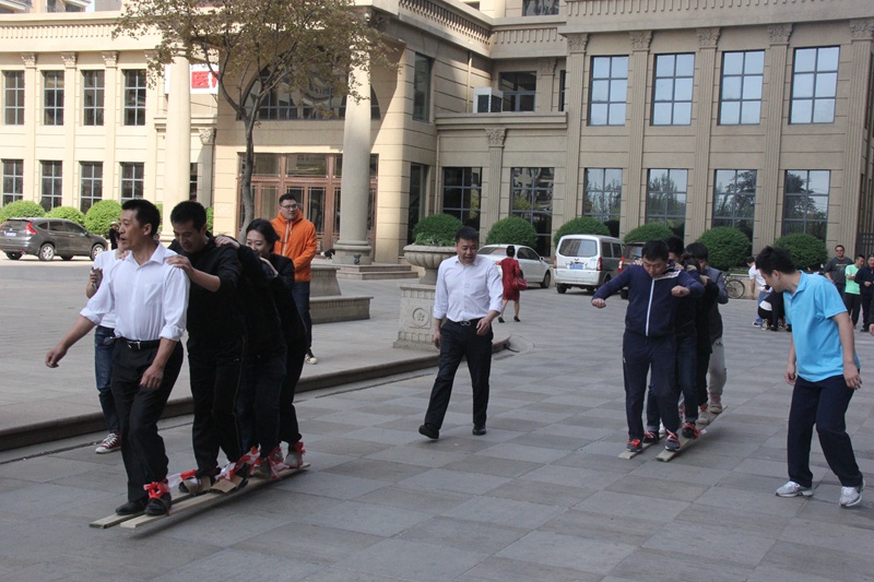 “齊心協力”項目比的就是大家的一致性,各代表隊派出二組選手,每組四名運動員,分別站在兩塊木板上,用繩固定腳與木板,雙手扶肩,從起點向終點出發(fā),在終點線交接后,下一組返回。萬豪酒店以絕對的優(yōu)勢取得第一名。